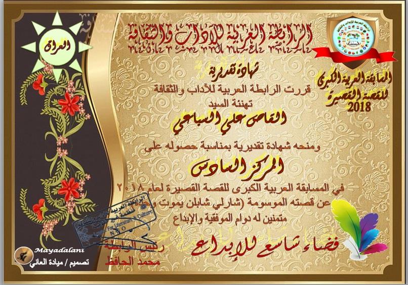 على المركز السادس في المسابقة العربية الكبرى الثالثة للقصة القصيرة للعام 2018 م ، دورة الروائي والقاص الراحل كاظم الحصيني ، والتي أقامتها الرابطة العربية للآداب والثقافة . ونهتبل هذه المناسبة الجميلة لنهنئ صديقنا المبدع المتميز علي السباعي على هذا التشريف المستحق الذي حظي به ، ونتمنى له المزيد من التألق والتوفيق والعطاء المائز ..