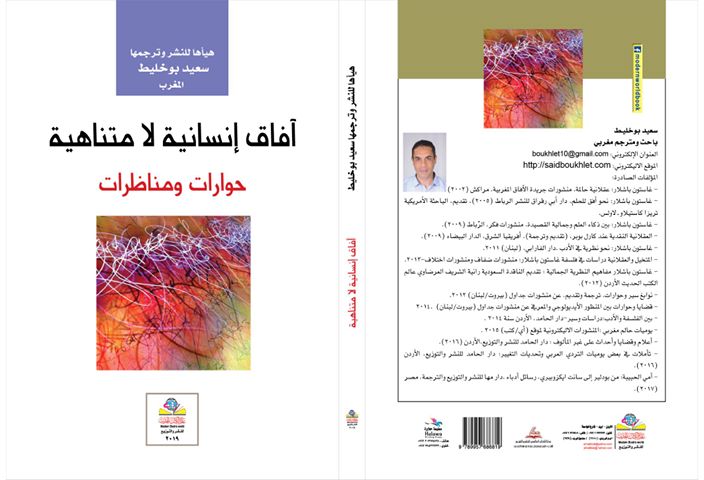 صدر حديثا عن دار عالم الكتب الحديث للنشر والتوزيع في الأردن، عمل جديد للباحث المغربي سعيد بوخليط (سعيد بوخليط) ، تحت عنوان : "آفاق إنسانية لامتناهية.. حوارات ومناظرات". تسعى هذه الترجمة إلى العربية، عبر ضمها لمتواليات هذه الفسيفساء الحوارية والتناظرية، عرض وتجميع وتأريخ وتوثيق، أفكار وتصورات بعض الشخصيات المهمة بالنسبة لمسار الثقافة الإنسانية حاضرا ، وكذا على امتداد المستقبل البعيد. إطار، حوارات وسجالات ونقاشات، تنوعت مصادر روافدها بين أصول الفلسفة والتاريخ والاقتصاد والموسيقى والطب والصحافة والتشكيل والرواية والأدب والتقنية وعلم الاجتماع ...إلخ. بقدر أيضا، انحدار أصحابها وانتمائهم إلى جغرافيات سوسيو- ثقافية مختلفة، عربية وأوروبية وأمريكية وإفريقية وآسيوية.