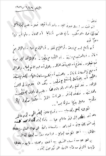 لم يمنعني عن الكتابة اليك طول هذه المدة غير أنني صريح كما تعلمين ولا أحب أن أخفي شيئاً - وقد كانت حالتي في هذه الأيام ولا تزال حتى كتابة هذا الخطاب غير سارة لأن المرض لازمني بشدة من يوم 13 رمضان حتى أنني اضطررت للافطار من هذا التاريخ للآن وحتى أصبحت نتيجة لهجمات المرض ولعدة عوامل أخرى حالتي في تدهور سريع مستمر - وكنت أحب أن لا أكتب اليك حتى لا أذكر لك شيئاً من ذلك قد يؤثر في صفو حياتك أو حياة أولادك في وقت أحب لكم فيه تمام الهدوء والسعادة والاستجمام.. ولم يدفعني للكتابة اليك الآن الا شدة قلقي على حالة سهير لأنني أشعر أن الأمر أكبر مما وصفته فأرجو بمجرد وصول هذا سرعة افادتي بالتفصيل عن حالة سهير وأسأل الله أن لا يكون بها أكثر من أثر ماء البحر.