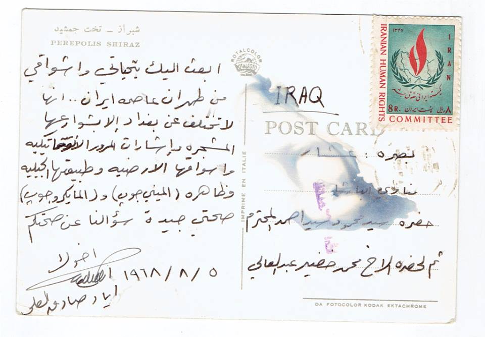 أبعث إليك بتحياتي وأشواقي من طهران عاصمة إيران ، إنها لا تختلف عن بغداد إلا بشوارعها المشجرة بإشارات المرور الأتوماتيكية ، وأسواقها الأرضية وطبيعتها الجبلية ، وظاهرة ( الميني جوب) و (المايكرو جوب)