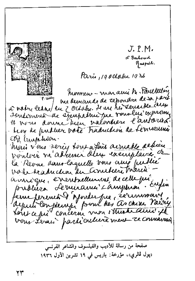رسالة جوابية من الشاعر والاديب الفرنسي بول فاليري إلى خليل هنداوي ، يرد فيها عن صديقه .. مؤرخة في باريس 19 أكتوبر 1936