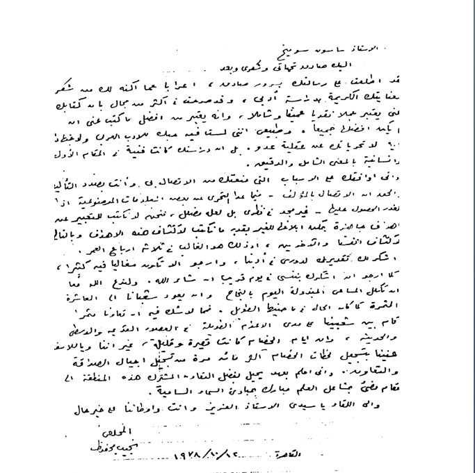 أطلعت على ر سالتك بسرور صادق، إعرابا عما أكنه لك من شكر لعنايتك الكريمة بدراسة أدبى وقد صرحت فى أكثر من مجال بأن كتابك عنى يعتبر عملا نقديا عميقا وعاملا وشاملا وأنه يعتبر من أفضل ما كتب عنى إن لم يكن أفضلها جميعا وطبيعى أننى لمست فيه حبك للأدب العربى ولاجتهاداتى فيه لا تحرياتك عن عقلية عدو بل أن دراستك كانت غنية فى المقام الأول وإنسانية بالمعنى الشامل والدقيق وأنى أوافقك على الأسباب التي منعتك من الاتصال بى وأنت بصدد التأليف والحق أن الاتصال بالمؤلف – فيما عدا التحرى عن بعض المعلومات الموضوعية إذا تعذر الحصول عليها غير مجد فى نظرى بل لعله مضلل فنحن لا نكتب للتعبير عن أهداف جاهزة يمكن إبلاغها للغير بقدر ما نكتب لاكتشاف هذه الأهداف وبالتالى لاكتشاف أنفسنا والآخرين وذلك هو الغالب فى ثلاثة أرباع العمر، شكراً لك تقديرك لدورى فى أدبنا وأرجو ألا تكون مغاليا فيه كثيراً أرجو أن أشكرك بنفسى فى يوم قريب إن شاء الله ولندع اللهم معا أن تكلل المساعى المبذولة اليوم بالنجاح وأن يعود شعبانا إلى المعاشرة المثمرة كما كان الحال فى ماضيهما الطويل فما لا شك فيه أن تعاونا مثمرا قام بين شعبينا على مدي الأعوام الطويلة فى العصور القديمة والوسطى والحديثة وأن أيام الخصام كانت قصير ة وقليلة غير أننا ويا للأسف عنينا بتسجيل لحظات الخصام أكثر مائة مرة من تسجيل أجيال الصداقة والتعاون وأنى أحلم بيوم يحيل بفضل التعاون المشترك هذه المنطقة إلى مقام مضئ بمشاعل العلم مبارك بمبادئ السماء السماوية وإلى اللقاء يا سيدى الأستاذ العزيز وأنت وأوطاننا على خير حال.
