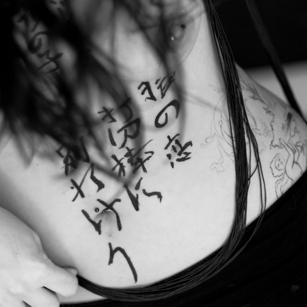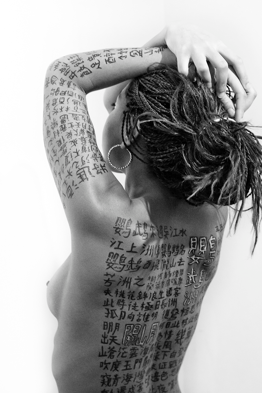 في بداية مشروعي ، كنت أنا من يقترح النصوص ويختار طريقة كتابتها على الجسم. وبعد ذلك ، تتطور الأشياء ، وأنا أكثر في وضع المشاركة مع النموذج. يبدأ خلال الاجتماع الأول ، عندما أقدم مشروعي إلى النموذج. هذا هو المكان الذي نتفق فيه على النص. عادة ، بالنسبة لموقع الكتابة ، أظل متحكماً. ومن ناحية أخرى ، وفيما يتعلق باختيار النص ، يختلف كل اجتماع مع نموذج. قد يكون هناك جاذبية خاصة للكتابة أو توقع نص منطقي. بالنسبة لقصيدة غيراسم لوكا Gherasim Luca ، كان ذلك طلباً شخصياً من العارضة وقررنا الاحتفاظ بالنسخة الفرنسية. وكانت لدي حالة أخرى حيث توصلت العارضة إلى نص قصير بالفرنسية ترغب في رؤيته مكتوباً بعدة لغات مختلفة.