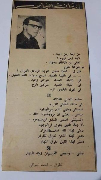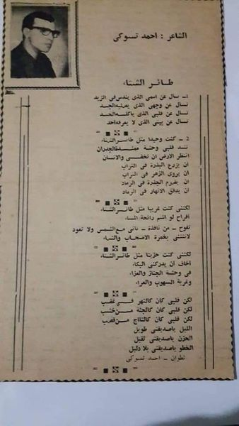 من يذكر هذا الشاعر الجميل ابن مدينة شفشاون « أحمد تسوكي ؟ ». وجدت ذاتَ مساء مصادفةً ، بعضَ قصائده بين أوراقي القديمة في قصاصات اقتطعتها من جريدة "العَلَم " ، نَشَرها الشاعرُ بها في أواسط الستينيات من القرن الماضي في صفحة «أصوات » ، وبعضُ هذه القصائد نشرتْها له مجلتان عريقتان هما مجلةُ « الأديب » ومجلةُ « الآداب » البيروتيتان . وقد تعرَّفْتُ على الشاعر في زمنِ صِبانا بمدينة تطوان. كان يعمل في مكتبة قريبِه السيد العافيَّة رحمه الله بـ حومة " الساقية الفوقية " حيث كانت توجد أهم المكتبات بتطوان . وكان شغوفا بالقراءة ، يلتهم ما كان يفد من الشرق من دواوين رواد الشعر المعاصر ومن كبريات المجلات العربية. كان رجلاً عصامياً وكانت موهبته الشعرية تعد بالكثير. وانقطعت عني أخباره بسبب الانتقال إلى الدراسة بمدينة فاس، وقد علمت فيما بعد عن طريق صديقنا المشترك عبدالقادر الإدريسي أنه انتقل إلى الرباط سنة 1967 م. للعمل بالصحافة في جريدة « الأنباء » التي كان يرأس تحريرها الشاعر محمد الطنجاوي رحمه الله. ولم ألتقِ به إلا مرة واحدة في الرباط مصادفة بعد سنوات طويلة. وبعد ذلك غابت عني أخباره . ولم أعرف ما إذا كان قد استمر في الكتابة الشعرية أم انقطع عنها ؟ وقد يكون العمل الصحافي بإكراهاته ومصاعبه المعروفة ، قد حال بينه وبين كتابة الشعر. ومن يقرأ ما نشره في جريدة العلم بصفحة " أصوات " من قصائد، يدرك أنها كانت تعد بميلاد شاعر متميز يضاف إلى كوكبة شعرائنا المغاربة المعاصرين. وهذه القصائد هي : " شاطىء الأحباب " ، و"بحثاً عن فارس " وقد مهرهما باسم مستعار هو أحمد ياسين ، والقصيدة الأولى نشرها في مجلة الآداب بعنوان " المرسى " باسمه الحقيقي ، و" طائر الشتاء " و " السقطة والعابرون " و " زمان اليأس " ، وهذه القصائد الأخيرة موقعة باسمه الحقيقي مصحوبة بصورته. والجدير بالإشارة أن للشاعر قصائد أخرى منشورة، لكنني لا أتوفر إلا على هذه النماذج التي احتفظت بها عقوداً من الزمن إعجاباً بها . وقد كنا ـ أصدقاءَه ومعارفَه المتأدبين من أقرانه ـ ننبهر حينما نرى بعض قصائده منشورة في المجلات التي كان لا ينشر بها إلا كبار الشعراء. ولم يكن آنذاك قد حصل على شهادة البكالوريا ، بل كان في تلك الفترة - إن لم تخني الذاكرة - منقطعا عن الدراسة .. ثم غادر شاعرنا أحمد تسوكي مدينة تطوان للعمل في جريدة الأنباء بالرباط كما سبق الذكر. انقطعت أخباره عني وعن أصدقائه حتى من كانوا يقطنون في نفس المدينة. كنت أعزه وأقدره باعتباره شاعراًمبدعاً وإنسانا حيياً متواضعا دمث الخلق . وقد عُرفَ عنهُ ابتعادُه عن الأضواء ، وزهدُه في اللقاءات والمنتديات الأدبية. لقد كان من أقرب أصدقائه أيام تطوان الأصدقاء : محمد بوخزار - المرحوم محمد أنقار - عبدالقادر الإدرسي. وشهادة حق في هذا الشاعر المثقف أنني عرفته قارئا نهما ، لم أجده في مكتبة قريبه السيد العافيَّة ، إلا وهو منكبٌّ على قراءة كتاب أو مجلة من المجلات التي تصل إلى المغرب من المشرق العربي ، أذكر منها هنا : الآداب - الأديب - المعرفة ( السورية ) – "المجلة" المصرية - المسرح - الهلال .. إلا أنه كان يمتحُ اتِّجاهَه الشعري من مجلة الآداب التي كانت تتجه اتجاها وجوديا ، وربما لَمَسْنَا في بعضِ قصائده المشار إليها أعلاه هذا الملمح الوجودي.