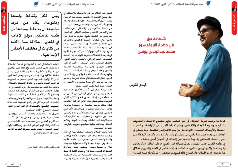 نسوق هذا الكلام من غير ما مجاملة ولا مبالغة في حق المبدع المتعدد البروفيسور محمد عبد الرحمن يونس، الذي أعده للحقيقة، رجل فكر وثقافة واسعة ومتنوعة، يكاد من فرط تواضعه أن يخجلنا، ومبدعا من طينة الناسكين، موثرا الإقامة في المعنى، انطلاقا مما راكمه من كتابات في مختلف الأجناس الإبداعية، وما مارس من أنشطة فكرية، مكرسا ما فاض عن واجبه المهني، للكتابة والبحث الاكاديمي، والإشراف على الاطاريح العلمية، ومساعدة الناس، تواقا الى توسيع هذه المدارك، وهذا الاهتمام وإعطائه مغزى وبعدا كوسموبوليتيا، مراكما تجربة فكرية ثرية، وعدة انشغالات متنوعة تتوزع ما بين القصة القصيرة، والسرد الروائي، والشعر، والنقد الأدبي، والمقال الفكري، وأدب الرسائل، والأدب الرحلي، والأدب المهجري، والدراسة المتخصصة المتسمة بالعمق والجدة، وتحرير مئات الدراسات المتنوعة، وطوح به هذا الشغف بالمعرفة، والجري وراء اكتسابها الى برد المنافي السحيقة، ناذرا حياته للغربات والمهاجر بدءا من موطنه الأم مرورا بعديد من الأمصار الى الصين حيث غاية طلب العلم ومنتهاه