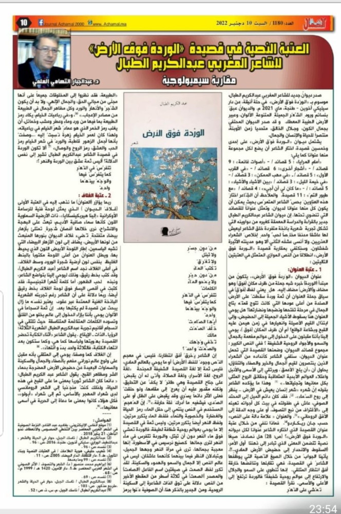 د. عبدالجبار العلمي - العتبة النصية في ديوان "الوردة فوق الأرض" للشاعر المغربي عبدالكريم الطبال.. مقاربة سيميولوجية