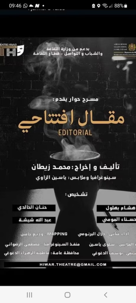 احتضنت قاعة مسرح مدينة الثقافة والفنون بأسفي مساء الأحد 22 يناير 2023 عرضا لمسرحية “مقال افتتاحي” لفرقة “حوار” في إطار الجولة التي تقوم بها الفرقة دعما من وزارة الثقافة والشباب والتواصل قطاع الثقافة… المسرحية من تأليف محمد زيطان، تشخيص كل من هشام بهلول في دور حمزة العرفاوي، حسناء المومني ي دور الصحفية فريدة، حنان الخالدي في دور الفانة التشكيلية كنزة زوجة الطاهر الخشباوي، وعبد الله شيشة في دور نادل بالمقهى…