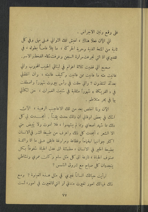 هذه عبارة مُثقلة بالاستعارات، وهي مع ذلك لا تفي بالمُراد في التعبير، فذلك البيت المشهور كئيب، وهذا الفؤاد المربَّى في جِنان الحب، المُغذَّ ى بالإخلاص والصبر هو كذلك كئيب؛ فقد كُنَّا في الصيف الماضي سعيدين بقربك، على همومك التي كُنَّا نشاركك بعضها )يشير إلى ما أصابها من مرض طيلة عامين كاملين في المستشفى ونسيان أصدقائها لها في هذه المحنة(، فكُنَّ ا نصمت ساعة تسكتين، وفي القلب وجمات، وكُنَّ ا نحاول ساعة تسترسلين في القنوط أن نقرِّ ب َ منك شمس لبنان بنورها وحرارتها، وأنوار سماء لبنان بما فيها من فيض السكينة والرجاء. وبعد ذلك كُنَّ ا نجلس إلى منضدة اللعب فننسى لؤم الناس ونفاقهم، وشعوذات الأطباء، وأحابيل المحامين، وتُرَّ هات الكهنة المحترمين.