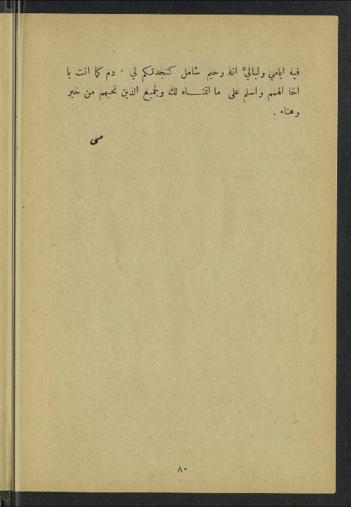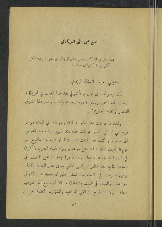 وأين تلك الأمسية في هذا الصيف؟ وأين الصيف في هذه السنة؟ وأين مي؟ تردَّ د صدى الصوت الذي طالما اعتصم بالإيمان، اليوم ربيع وغدًا صيفٌّ ، وبعد ذلك؟ الربيع لا يُخلف وعده، ورُسُ ل الربيع لا يكذبون، ِ وبعد غد ٍ قَر ٌّ وصر وأنت يا مي وأنا في رسله، دام ابتسامه، وطالت أيامه، فمتى تعودين إلى لبنان؟ إنك ِ لمن المؤمنات، وإنك ِ لمن الصادقات، وإن أمسية ذلك الصيف، ومن سعدوا فيها ليذكرونك ِ على الدوام.«