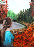 اللوحة الثانية: وحملت عنوان "فقدت بعضي وأنا أبحث عنه" وهذ العنوان يثير السؤال أين تبحث؟ وحين نتأمل اللوحة نرى الجواب وهو أنها تبحث عن بعضها في عالم الجمال وسحر الطبيعة، حيث نجد في اللوحة المرأة تقف على حافة جدول ماء يخترق غابة بشكل جانبي بدون أن يظهر وجهها، برداء أزرق مريح للنفس وشعر منسدل على الظهر بتسريحة بسيطة وجميلة، تنظر للجدول والأشجار بتأمل حالمة بأن تكون حياتها بهذا الجمال بعيدا عن التعنيف والتنمر، ومن خلال الاسقاط الضوئي نجد أن قلب اللوحة حيث تنظر المرأة هو المنير واللون الأخضر حيث مسقط الضوء مثير للبهجة، بينما الجانب الأيمن معتم والأيسر أكثر اضاءة والأرض.