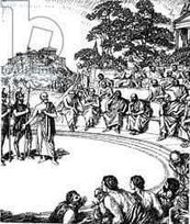 خمسمائةُ قاضٍ جلسُوا ، الواحد بجانب الآخر ، على المُدرَّج ذي المَقاعد الخشبيَّة المُغطاة بِالحُصُر ، وفي مواجهتهم ، رئيسُ المحكمة مُحاطاً بِكاتبهِ والحَرَس . وفي أسفلِ المدرَّج وُضِعَ الصُّندوقُ الَّذي سيضع فيه القضاةُ أحكامَهم بعد انتهاء المحاكمة . الجلسةُ عَلَنيَّةٌ . ولا يُسمَح فيها لِغير الرِّجال بالحُضور . أمَّا الطَّقسُ ، فقد كان جميلاً ، مِمَّا أدخلَ الارتياحَ إِلى نفُوس الجميعِ _ ما عدا تلاميذَ سقراط من الفلاسفة وعلى رأسهم ( أفلاطون) _ وجعلهم يأملونَ بجلسةٍ كاملةٍ لا يربكُ مجراها مطرٌ يهطلُ على الرُّؤوس أو بردٌ يعطِّل تواصلَ الأفكار . وذلك في محكمةٍ انعقدتْ في الهواء الطَّلق في أثينا ، في صباح من أصبحة ربيع عام 399 قبل الميلاد