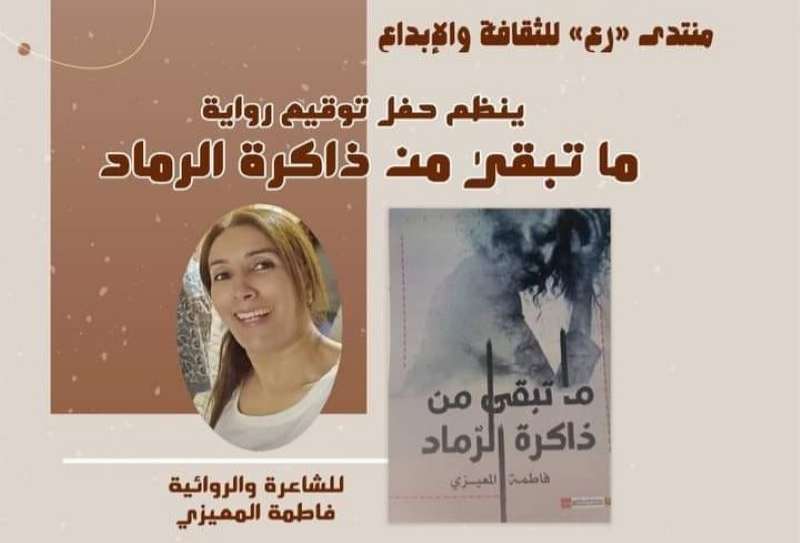 - يضاف إلى ذلك الرواية وموضوع دراستنا اليوم وهي رواية فاطمة المعيزي "ما تبقى من ذاكرة الرماد" الصادرة عن مؤسسة بيبلومانيا سنة 2022