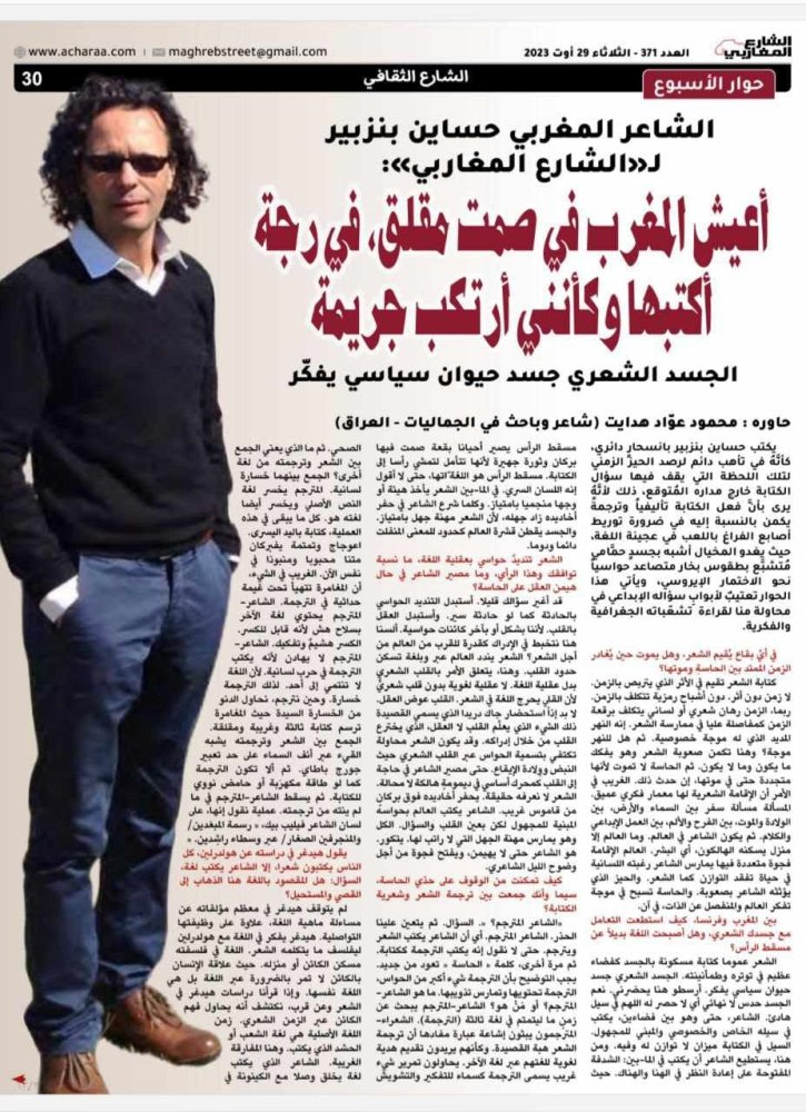 > ج 2: الشعر عموما كتابة مسكونة بالجسد كفضاء عظيم في توتره وطمأنينته. الجسد الشعري جسد حيوان سياسي يفكر. أرسطو هنا يحضرني. نعم الجسد حدس لا نهائي أي لا حصر له اللهم في سيل هادئ. الشاعر، حتى وهو بين فضاءين، يكتب في سيله الخاص والخصوصي والمبني للمجهول. السيل في الكتابة ميزان لا توازن له وفيه. ومن هنا، يستطيع الشاعر أن يكتب في الما-بين: الشدفة المفتوحة على إعادة النظر في الهنا والهناك. حيث مسقط الرأس يصير أحيانا بقعة صمت فيها بركان وثورة جهيرة لأنها تتأمل لتمشي رأسا إلى الكتابة. مسقط الرأس هو اللغة ّاتها، حتى لا أقول إنه اللسان السري. في الما-بين الشعر يأخذ هيئة أو وجها منجميا بامتياز. وكلما شرع الشاعر في حفر أخاديده زاد جهله، لأن الشعر مهنة جهل بامتياز. والجسد يقطن قشرة العالم كحدود للمعنى المنفلت دائما ودوما.