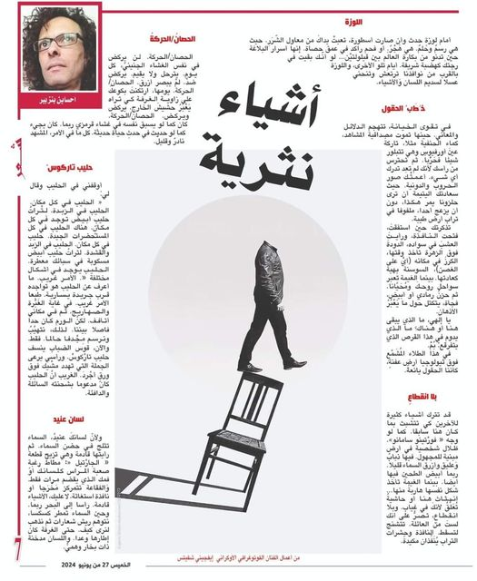 " الحليب في كل مكان. الحليب في الزبدة. لِتْراتُ حليبٍ أبيض توجد في كل مكانٍ. هناك الحليب في كل المستحضرات الجيدة. حليب في كل مكان. الحليب في الزبد والقشدة. لِتْراتُ حليب أبيض مسكوبة في سبائك معطرة. الحليب يوجد في أشكال مختلفة ". الأمر غريب. ما أعرف عن الحليب هو تواجده قرب جريدة يسارية. طبعا الأمر غريب. في غاية الغَبْرة والصهاريج. ثم في مكاني أتأفف. لكنَّ الورم كان حدا فاصلا بيننا. لذلك، نتهيَّبُ ونرسم مِجْدفا حالما. فقط. والآن، قوس الضباب ينسف حليب تارْكوسْ. ورأسي يرعى الجملة التي تهدد مشْيك فوق ورقٍ أجْردَ. الغريب أنَّ الحليب كان مدعوما بشحنته السائلة والدافئة.