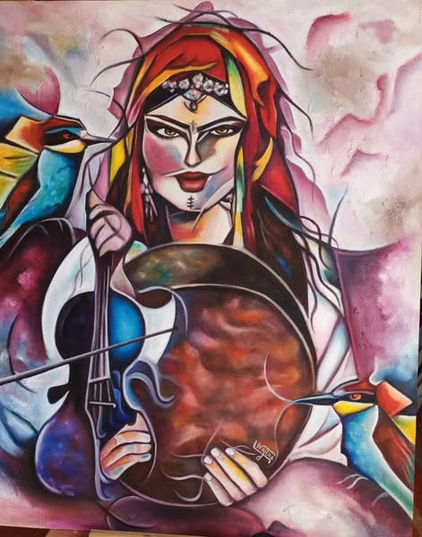 امراة تمسك دفا/بنديرا بلون مثير؛ يغلب عليه اللون البني المغلق في وسطه؛ اما الدائرة المؤطرة له فتحددها بلون بني اكثر انغلاقا في بنيته؛ وهي إشارات لونية مقصودة؛من جهة تحيل على تجاذب الألوان الدالة على الهيحان ومن جهة أخرى ترسل شفرات الجمال؛ فنصبح بذلك امام شكلين من أشكال التواصل:اولهما جاذب والثاني مهيج وهائج؛ لكن وجود الطائر بإشارته المرسلة بلغة عندليبية الصوت في قاع البندير يصبح الهيجان مميزا بطابع عندليبي محض. لكن الملاحظة التي ركزت عليها الفنانة هي تموضع الطائرين(العندليبين) أحدهما ينقر الدف/البندير فيرسل عبره صوته المليء بألوان الدفء وبعذوبة الجمال الصوتي؛ في الجهة الاخرى (الأعلى) نجد عندليبا آخر ينقر بصوته في اذن المرأة الحاملة للبندير؛ فنتحول بذلك إلى دلالات عميقة كلها تتكلم عن فنانة تتلقى الجمال من لون جمالها؛ كما تتلقى الصوت الرائع الجميل من آلات مثيرة بهندستها وموقعها؛ هما معا يشكلان شفرتان ترميزيتان بإشارات محددة: