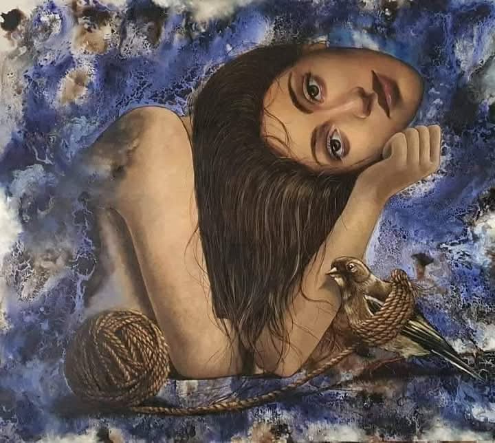 لوحة بوجوه متعددة؛ ابرز الوجوه فيها وجه امرأة يتموضع بشكل غرائبي مثير؛ بين يدين؛ في الاعلى يوجد راس مقلوب؛ الشعر يتجه نحو الأسفل واليد الأولى متمكنة من احتضانه والأخرى نصفها مختف والطرف الآخر متصل بفضاء طغى عليه الأزرق السماوي. وجوه مشتتة بشكل باهت بأشكال غير عادية منها ماهو حيواني وشيطاني وآخر قادم من عالم مغاير عن عالمنا؛ زاد من غموض الصور وجود طائر مقيد بحبل قيد جناحيه ومنعه من الطيران. زاد من تماسك هذه الصور وتقاربها هيمنة اللون الازرق وامتزاجه بالأبيض؛ رغم أن اللونين معا يوحيان إلى الايجاب إلا أنهما في اللوحة غيرا وظيفتهما العادية ليؤديا وظيفة نقيض؛ لأنهما جاءتا محددتين بهيجان يحيل على تلولب الأمواج مما جعل منهما في وضع هيجان و قلق.