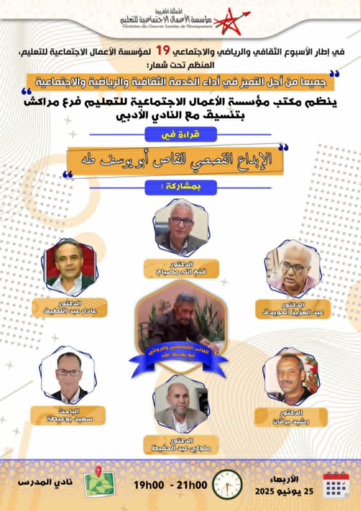 نظمت مؤسسة الأعمال الاجتماعية للتعليم بمراكش أمسية ثقافية اندرجت في إطار أسبوعها الثقافي المتنوع الممتد من 23 إلى غاية 29 يونيو 2025 بنادي المدرس /المركب الاجتماعي الزهراء الداوديات مراكش. كان موضوع الأمسية يدور حول تجربة أبو يوسف طه القصصية. أطر الأمسية الأساتذة عبد العزيز الحويدق ورشيد برقان وعادل عبد اللطيف وعبد الحفيظ ملوكي وسعيد بوعيطة تسيير الأستاذ فتح الله مصباح.
