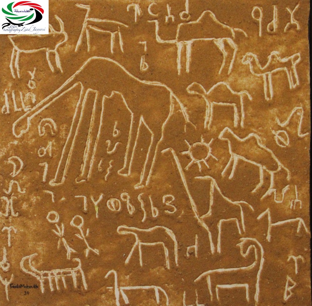 المحور الثالث كان النقوش على الصخور، حيث التقطت الفنانة مقطعين مختلفين أبدعت فيهما التعرية الجوية أشكالًا فنية، أحدهما مقطع طولي والثاني أشبه بأمواج البحر. والمحور الرابع كان لوحتين لجبال وادي رم، الأولى بألوان طبيعية ذهبية بفعل انعكاس الشمس، والثانية بتباين لوني بين البنفسجي والذهبي، الأولى أقرب بألوانها للطبيعة حيث الجبال في الأفق مع انعكاسات الشمس عليها فظهرت كجبال ذهبية تمتد الرمال أمامها مع نباتات صحرواية، فتمازج اللون الذهبي مع الأصفر المغبر مع الأخضر المتناثر، في لوحة تأسر الناظر إليها، واللوحة الثانية أظهرت جمال الشمس على طرف أعلى الجبال وإنعكاسها الذهبي على تلة من التلال، بينما باقي التلال على جانبيها تفاوتت ألوانها بين العتمة والبنفسجي، والأرض الممتدة باللون البنفسجي الساحر الموشح بالأصفر المتفاوت بين لون رمل وادي رم الطبيعي وبين اللون الذهبي، مزينة ببعض النباتات الصحراوية على يمين اللوحة وشجيرات جافة في زاوية اللوحة اليسرى، خالقة جمال آخر اعتمد على حرفية التباين والتناقض بين الألوان.