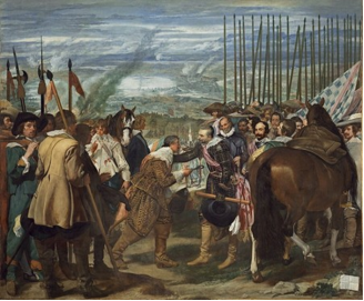 لوحة "استسلام بريدا" لفيلاسكيز، ١٦٣٤، تؤرخ لنهاية حرب فلاندرز (حرب استمرت ٨٠ عامًا حاولت فيها هولندا التحرر من نير إسبانيا). وبينما كان الجيش الإسباني يُعجب بشجاعة أعدائه خلال حصار بريدا، أمر الجنرالات بمعاملة المهزومين معاملة حسنة. رسم فيلاسكيز لحظة المجاملة التاريخية، عندما منع الجنرال الإسباني أمبروجيو سبينولا جاستن من ناسو من الركوع عند قدميه بتسليمه مفاتيح بريدا. تُظهر هذه اللوحة كرم الإسبان.
