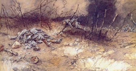 تُظهر لوحة "على الجبهة"، كرون، ٥ أيار ١٩١٧، حقلاً مليئاً بالقذائف والجثث المهجورة وسط الأسلاك الشائكة.