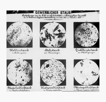 ويبرز دور الكاميرا في هذا التحول من خلال لوحين زجاجيين سلبيين من مجموعة معهد العرض العلمي (Institut für wissenschaftliche Projektion)، وهو مكتبة صور تجارية أسسها فرانز ستودتنر لتوفير الشرائح والمطبوعات للباحثين والمحاضرين. يحتوي كل لوح على ست صور مجهرية مرتبة في شبكة دقيقة. تُظهر هذه الصور مجتمعةً جزيئات غبار مختلفة، مُكبّرة بشكل كبير، مصدرها الهواء المحيط في مواقع صناعية مختلفة (الشكلان 2 و3). قبل انضمامها إلى مجموعة ستودتنر، عُرضت هذه الصور المجهرية للجمهور في معرض برلين للنظافة عام 1883، في جناح تابع لمفتش المصانع فرانز رايشل، مُخصص لـ"تدابير حماية العمال ورفاهيتهم" " 5" ، إلى جانب نماذج ورسومات وأشياء أخرى متنوعة. بينما كانت شركة كارل زايس تعرض في جناح آخر من المعرض مجموعة واسعة من الأجهزة القادرة على إنتاج مثل هذه الصور، بدا أن التصوير الفوتوغرافي في جناح رايشل يلعب دورًا توضيحيًا وتعليميًا أكثر. فبفضل مستوى الدقة والتكبير الذي توفره تقنية التصوير المجهري، قدمت هذه الصور عرضًا مذهلاً لتنوع الجسيمات المحمولة جوًا المنبعثة من الأنشطة الصناعية، مما مهد الطريق للعارضين المجاورين الذين كانوا يعرضون مجموعة كاملة من أجهزة كبح الغبار وترشيحه، بما في ذلك النظارات الواقية وأقنعة الغاز وأنظمة تنقية الهواء de filtration de l’air.